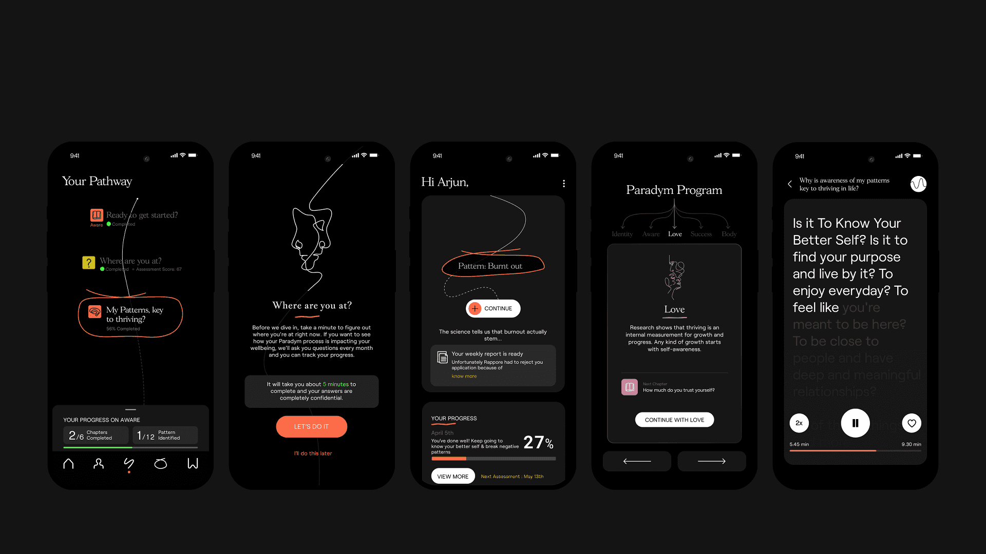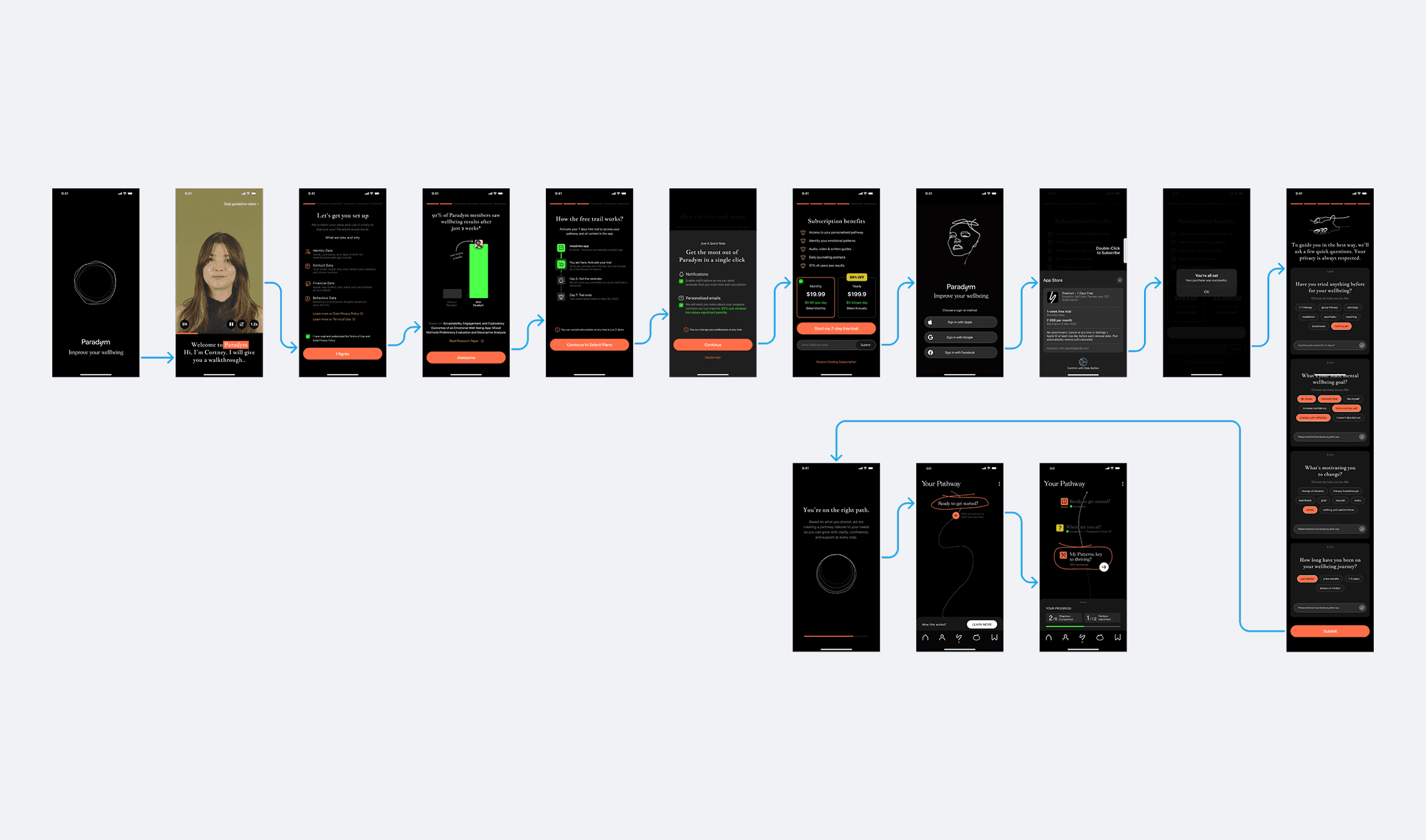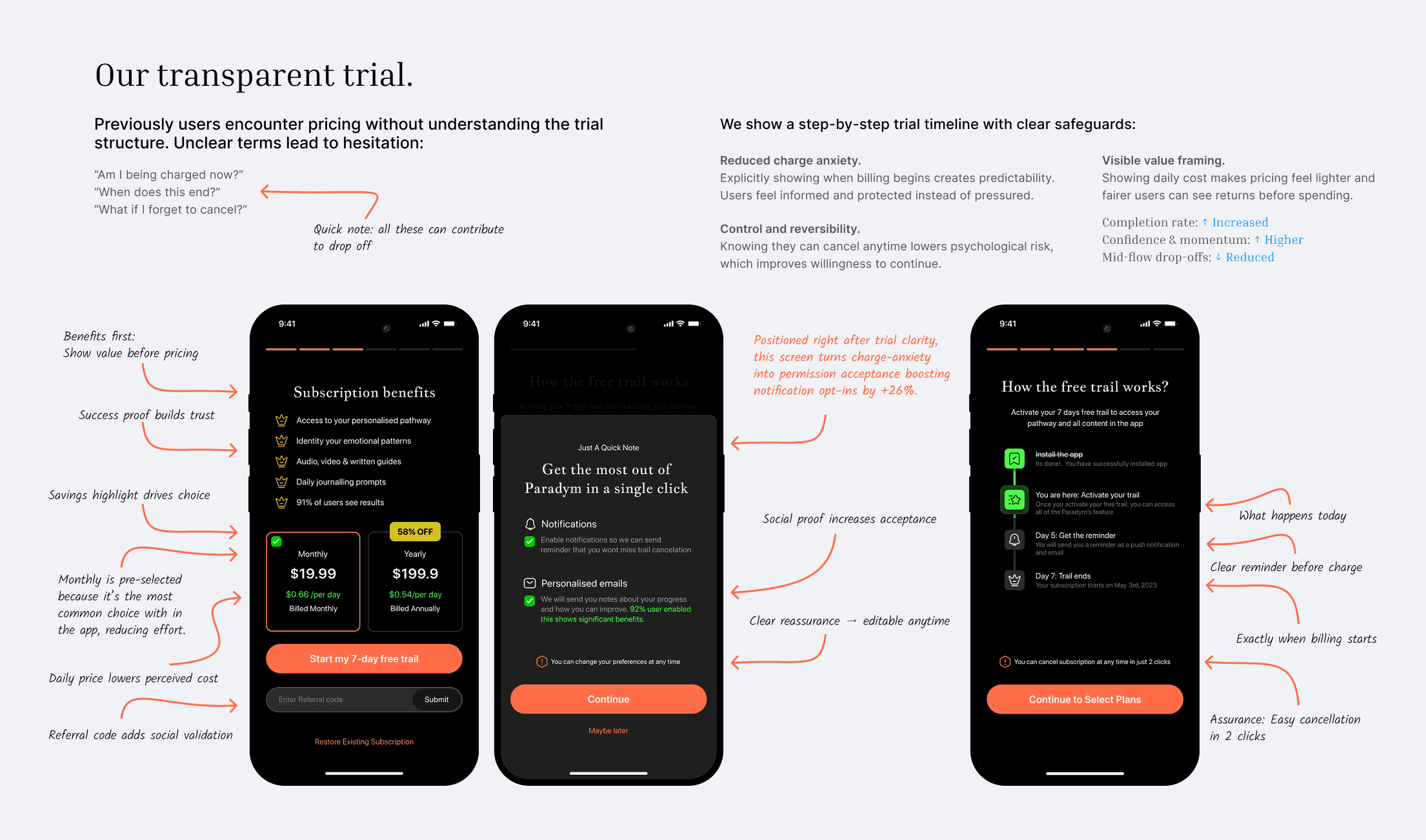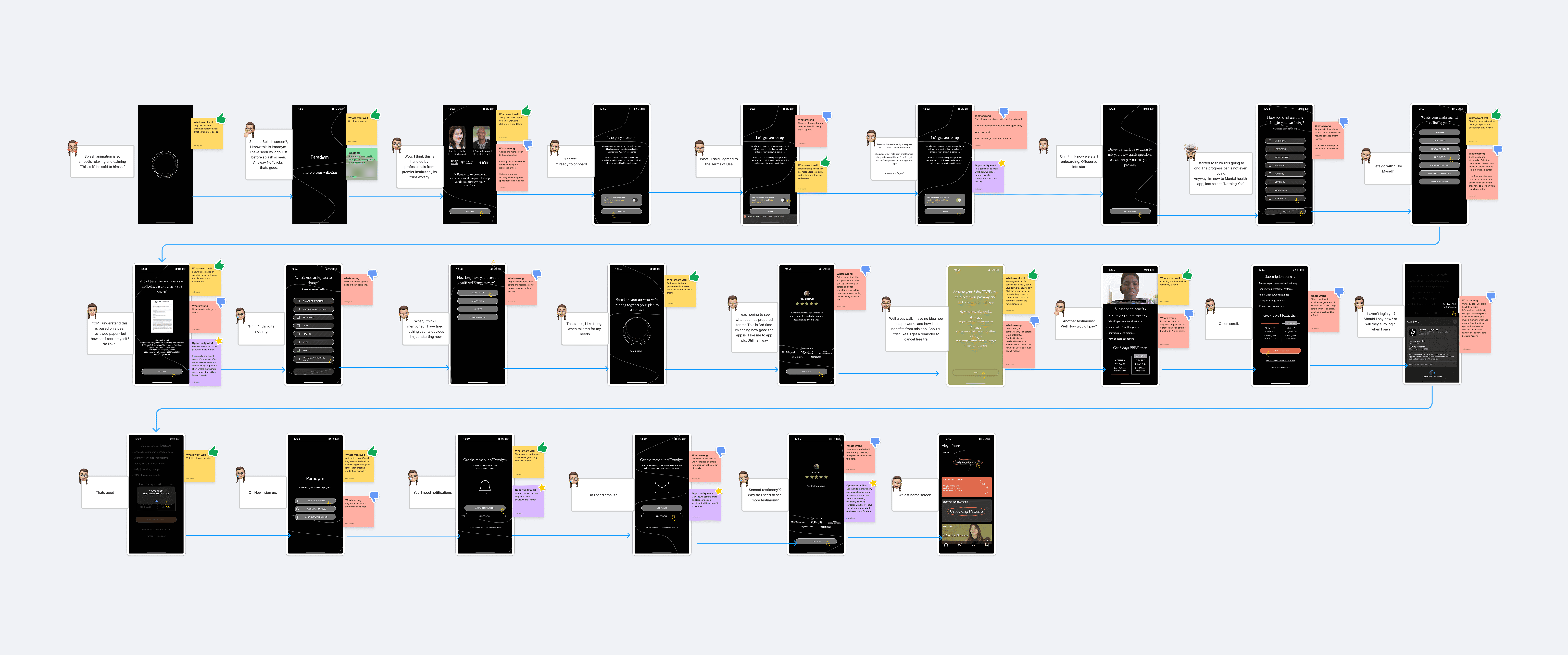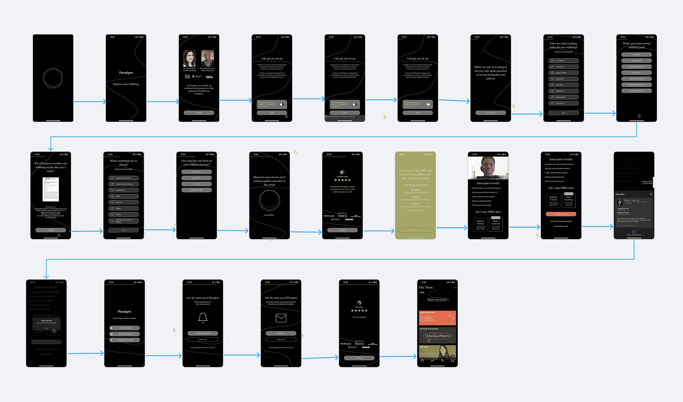 Paradym is an emotional wellbeing app where users arrive feeling vulnerable and skeptical. My mission was to redesign onboarding so users feel safe, understood, and motivated to continue without cognitive overload or early financial pressure.