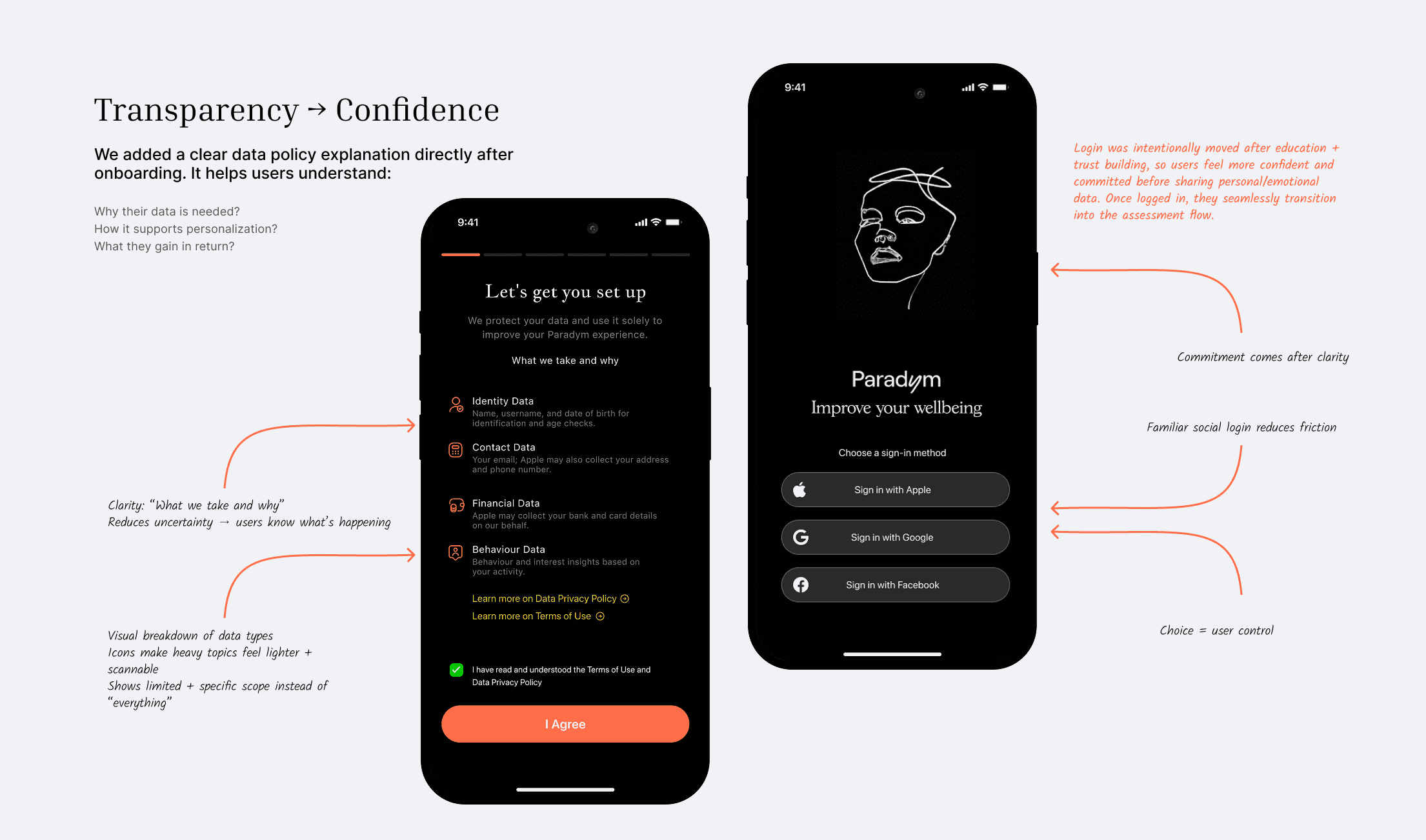 In the first iteration, login was placed at the end of onboarding to remove friction but with 42% mid-flow drop-off, we may loose all ability to re-engage users. We moved login to just before the paywall, preserving early emotional safety while ensuring the business could recover drop-offs and maintain revenue continuity.