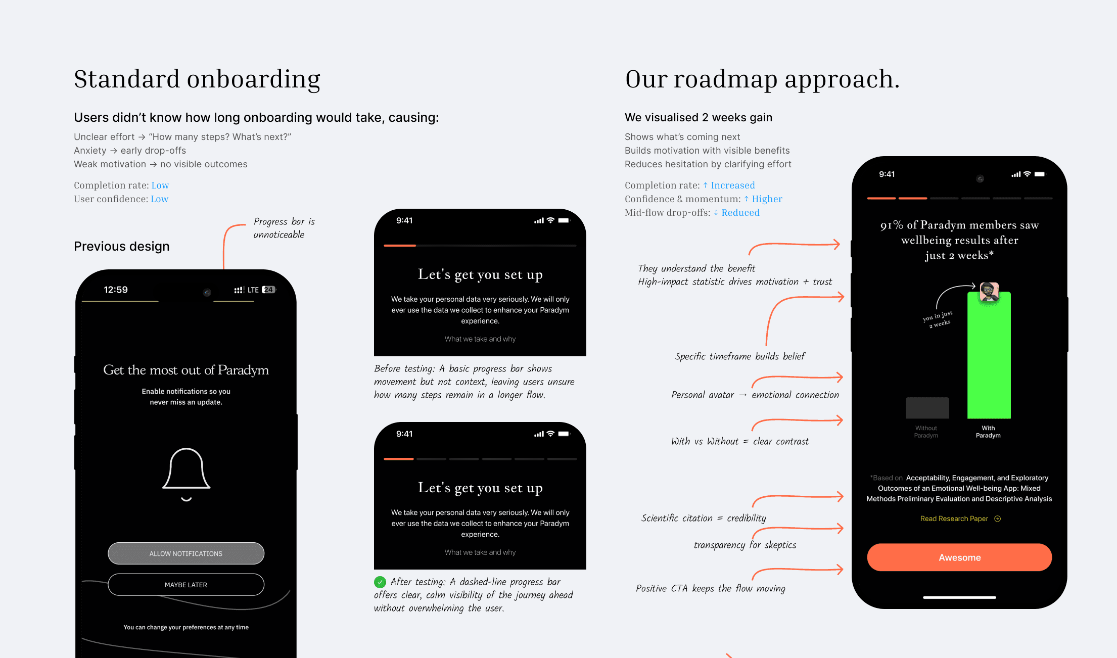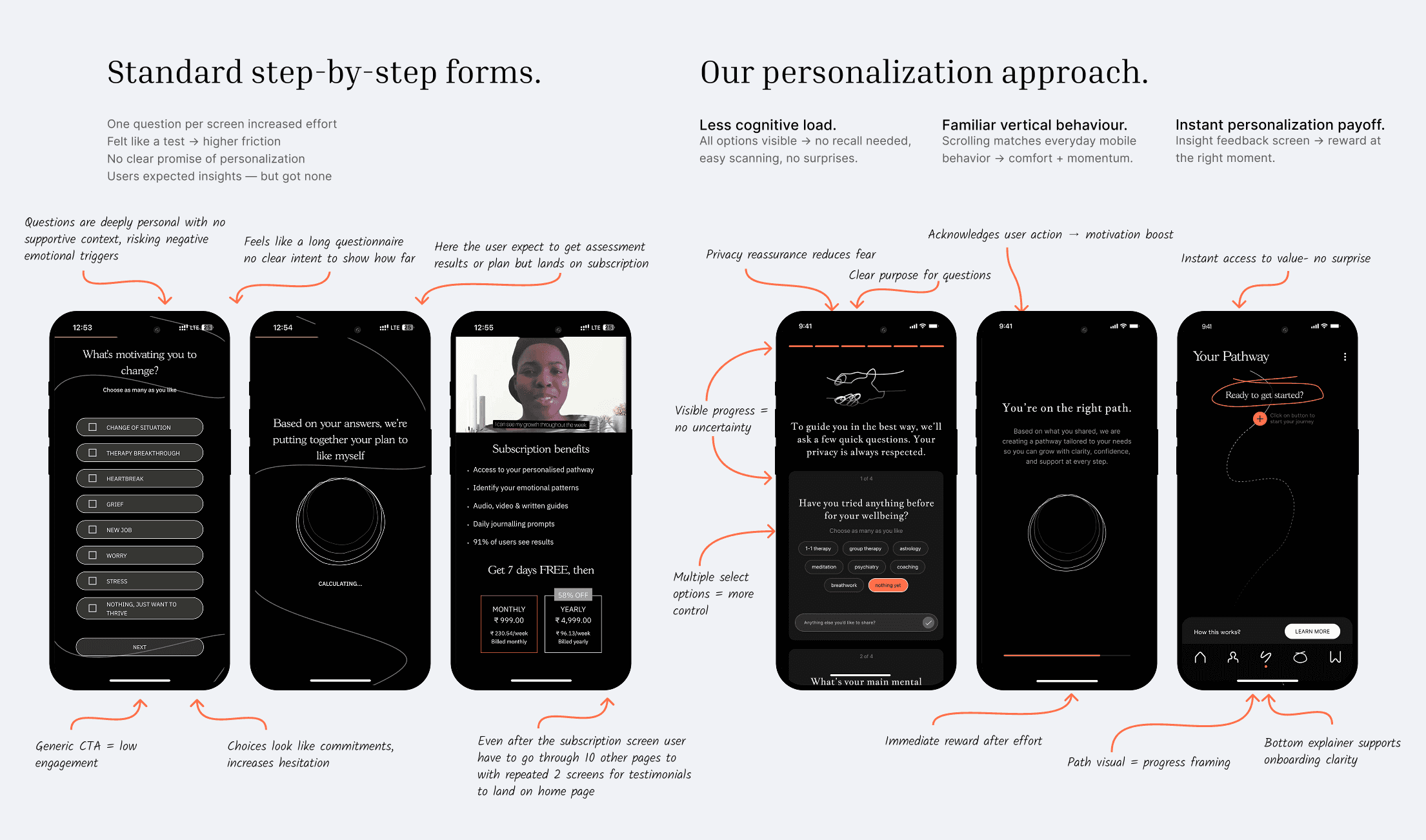 By reordering onboarding to educate first, I built a calmer bridge into the product without reinventing the flow.
