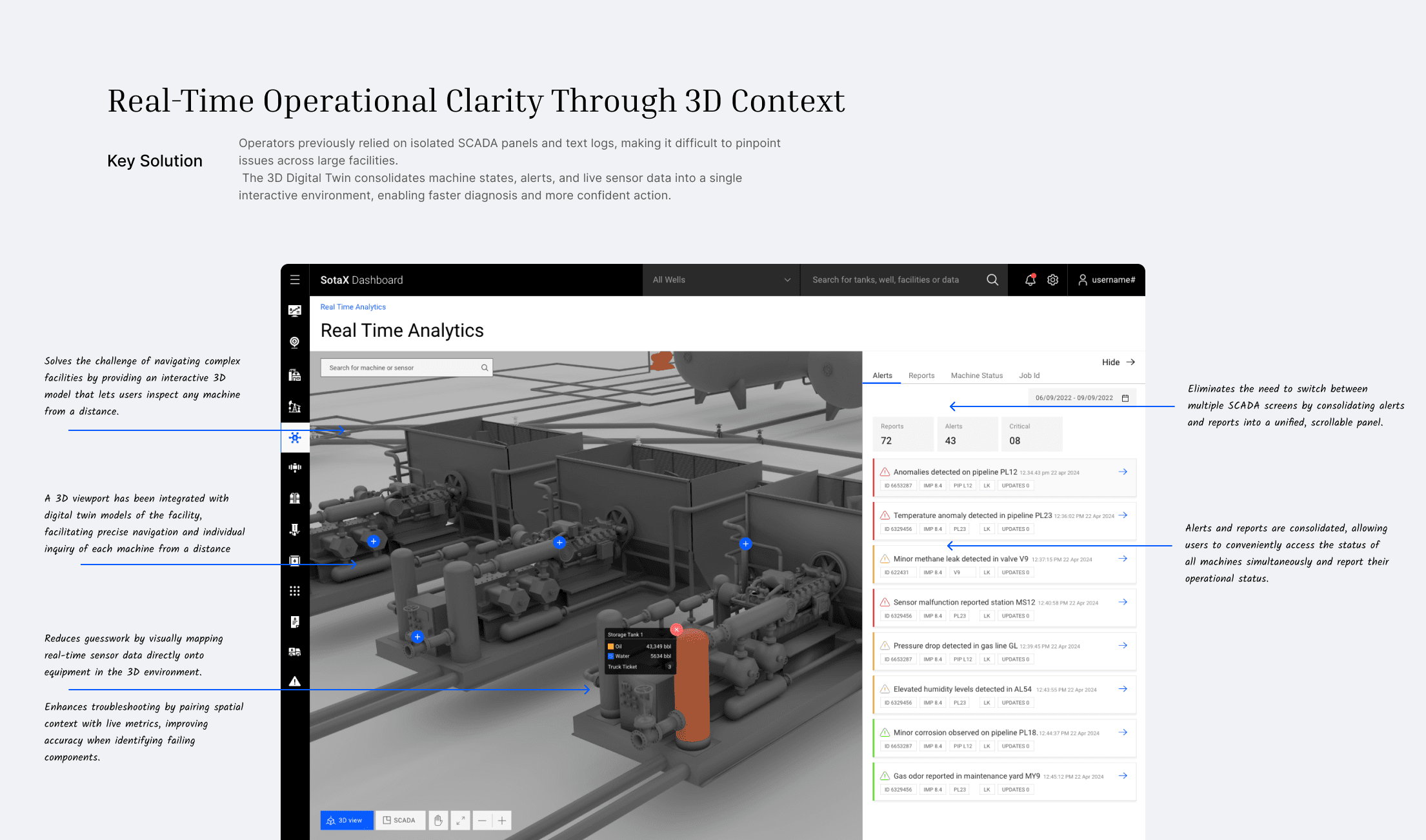 Static SCADA screens lacked real-world context, 3D visibility, or integrated analytics. Users couldn’t visualize facility workflows or detect faulty assets early.